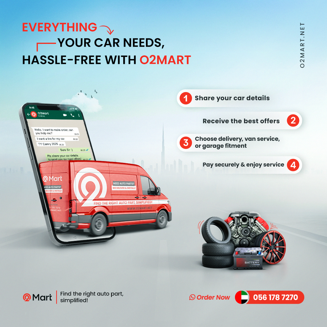 O2Mart is the UAE’s trusted one-stop online platform for auto parts, tyres, batteries, and rims. We provide high-quality automotive products and reliable solutions for drivers looking for genuine parts and professional car services. Whether you need auto parts in Dubai, tyre replacement, or car battery replacement, O2Mart makes the process simple, fast, and convenient. Customers can easily order online with quick delivery or book professional fitment services for a hassle-free experience. We proudly serve across Dubai, Abu Dhabi, providing dependable auto parts and car service solutions. O2Mart focuses on quality and customer satisfaction, helping you get back on the road safely and quickly. Your reliable one-stop shop for all things auto